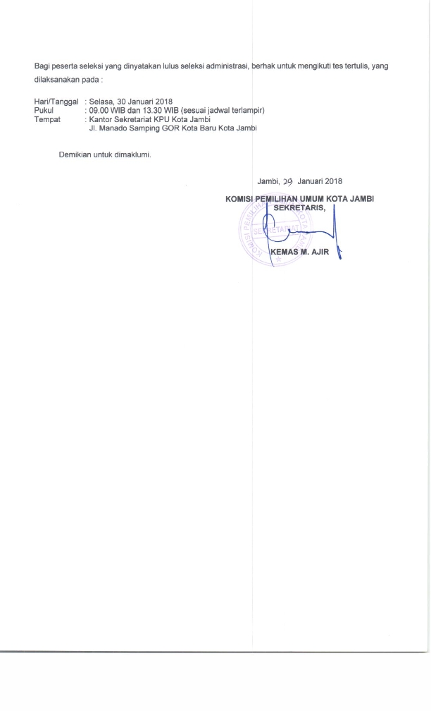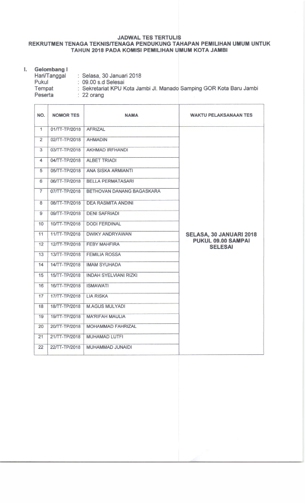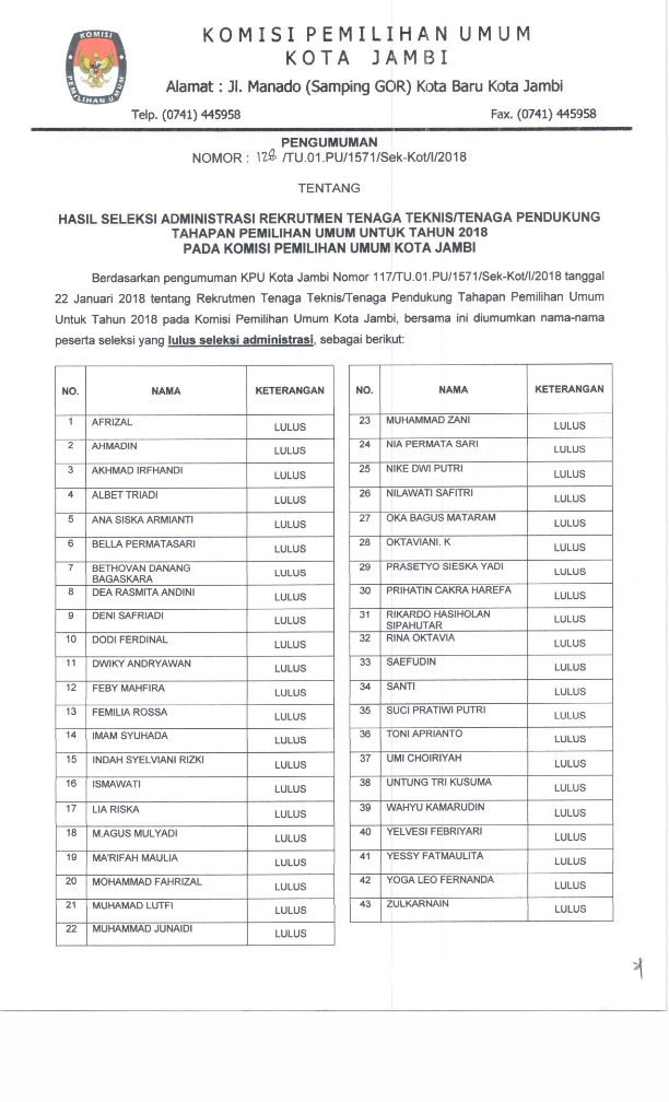 Berdasarkan pengumuman KPU Kota Jambi Nomor 117/TU.01.PU/1571/Sek-Kot/I/2018 tanggal 22 Januari 2018 tentang Rekrutmen Tenaga Teknis/Tenaga Pendukung Tahapan Pemilihan Umum Untuk Tahun 2018 pada Komisi Pemilihan Umum Kota Jambi, bersama ini diumumkan nama-nama peserta seleksi yang lulus seleksi administrasi, sebagai berikut :