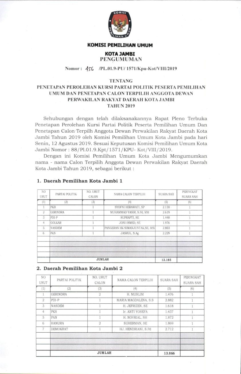 PENGUMUMAN CALON TERPILIH DPRD KOTA JAMBI PADA PEMILU TAHUN 2019 | Official Website KPU Kota Jambi |KPU-JAMBIKOTA.GO.ID