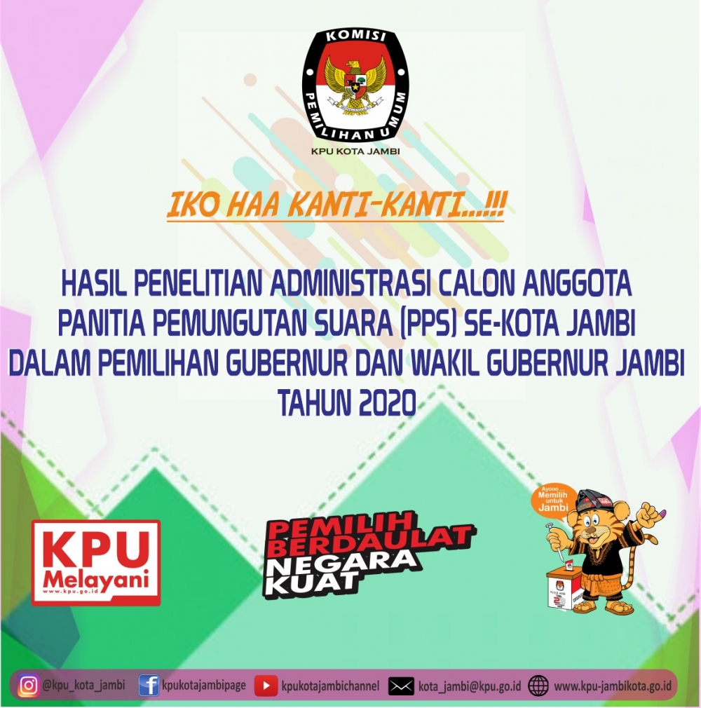 PENGUMUMAN HASIL PENELITIAN ADMINISTRASI CALON ANGGOTA PANITIA PEMUNGITAN SUARA (PPS) SE-KOTA JAMBI DALAM PEMILIHAN GUBERNUR DAN WAKIL GUBERNUR JAMBI TAHUN 2020 | Official Website KPU Kota Jambi |KPU-JAMBIKOTA.GO.ID